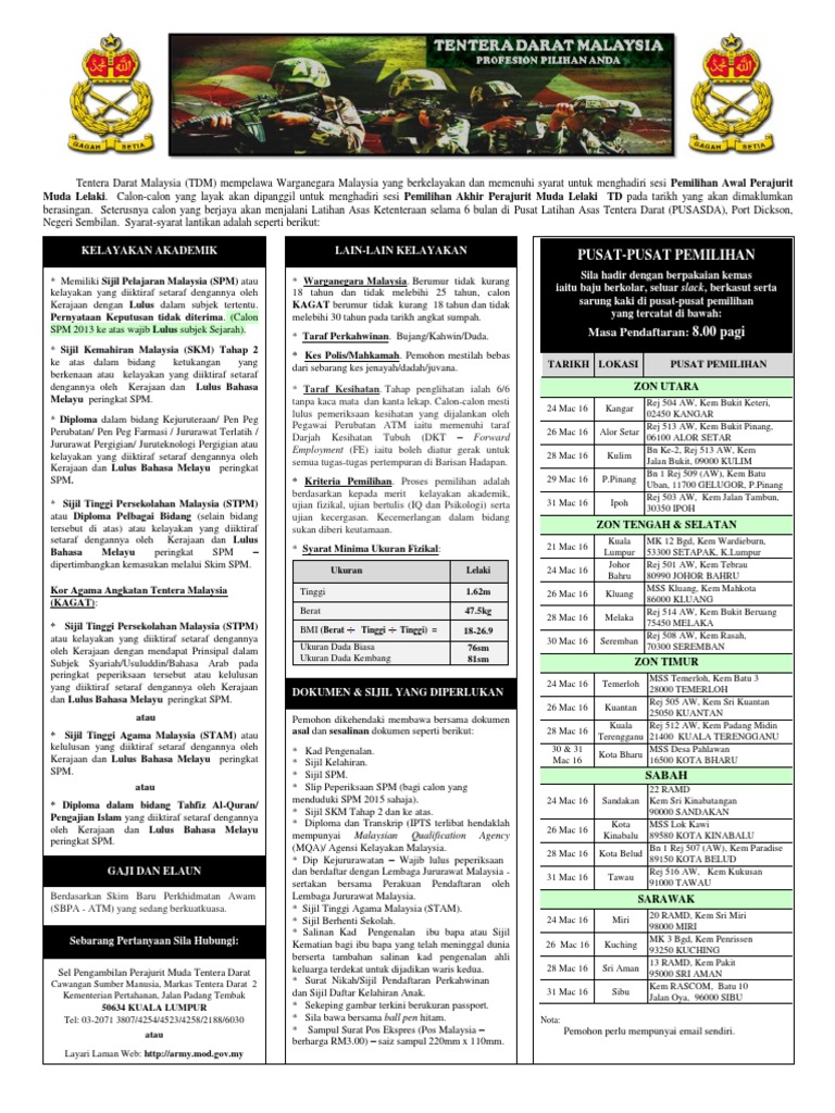 Permohonan awal adalah melalui pendaftaran secara atas talian online registration melalui Sistem Pengambilan Perajurit Muda Tentera Darat SPPMTD di. Tentera Darat Malaysia kini membuka permohonan pengambilan Perajurit Muda Lelaki Siri 195 bagi tahun 2022. Penglihatan Boleh melihat dengan jelas tanpa cermin mata atau kanta lekap Tidak rabun warna.
